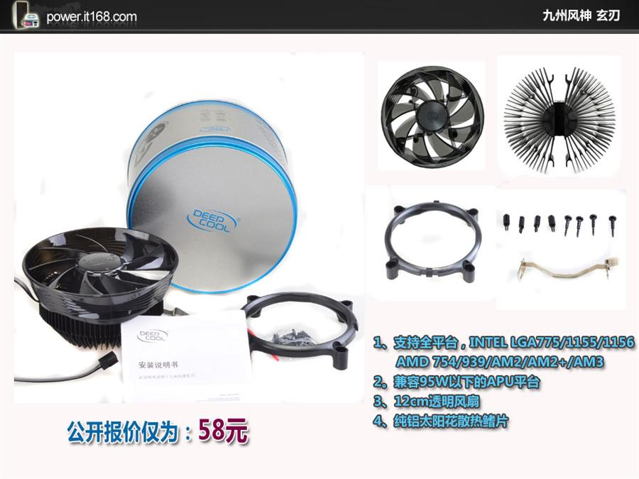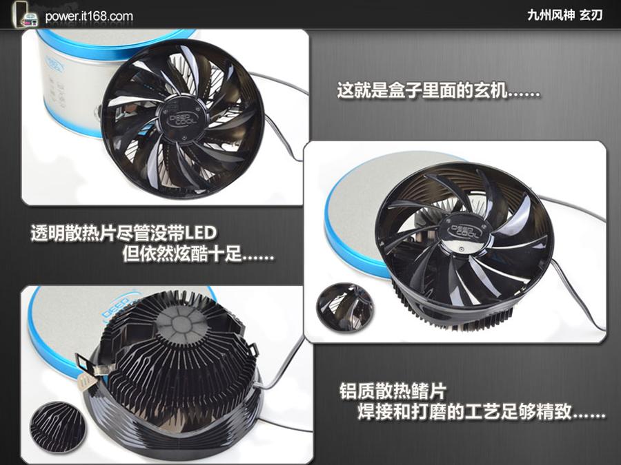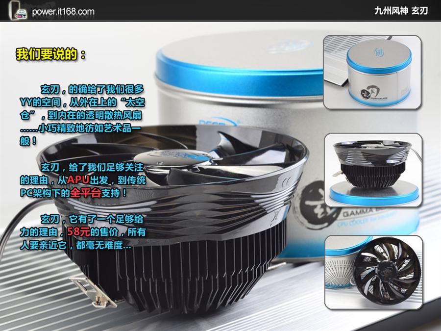 挑散热器,我们可以看块头,看热管,看鳍片,看高塔,看底座……同样我们可以看造型,看设计,看包装,这些一样可以给我们足够的YY空间……今天闪亮登场的九州风神玄刃,它一边挟着APU的强大后台,另一边嚷着支持全平台散热的口号,更重要的,是由里到外的“精致”、“炫酷”,它让我们知道,其实散热器也能是一个妆点DIY的,艺术品……