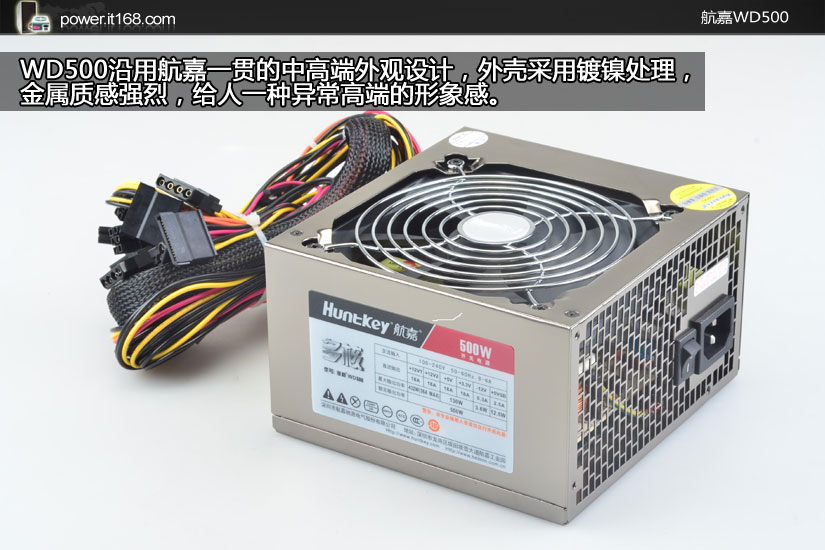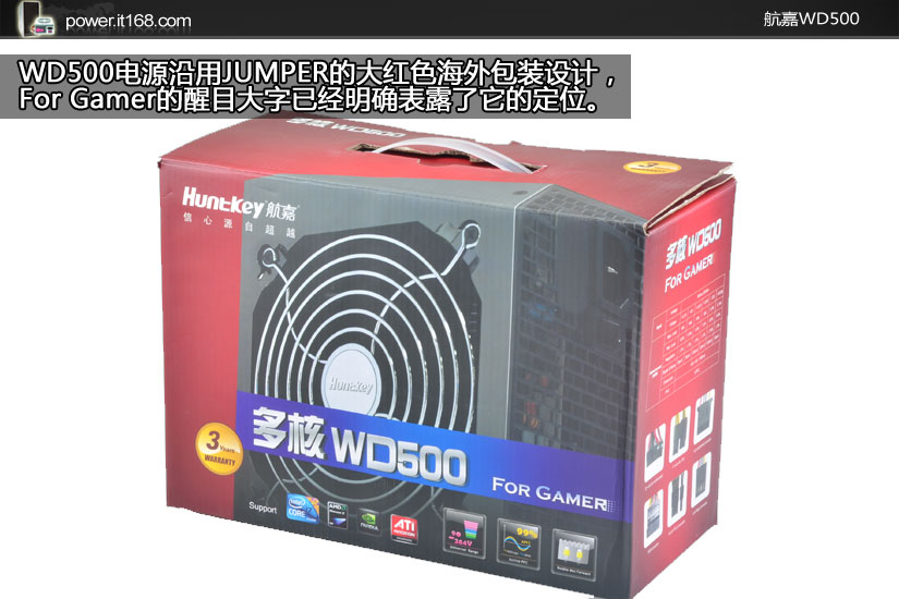航嘉继JUMPER550电源后,再面向市场推出采用海外包装的耀眼新产品WD500。航嘉在努力完善和巩固已有产品线的同时,不断地创新研发新的耀眼明星产品,虽然它没有获得80PLUS认证,但它的转换效率已达到80PLUS白牌标准。虽然它的外观不算太抢眼也不花巧,但它有拥有强劲的实力,完美带动高端平台,现在我们就带给你WD500最真实的一面。