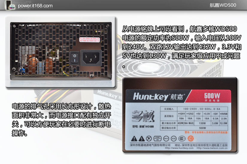 从电源铭牌上可以看到,航嘉多核WD500电源的额定功率为500W,输入电压从100V到240V。双路12V输出达到432W,3.3V和5V也达到130W,满足玩家级应用不成问题。