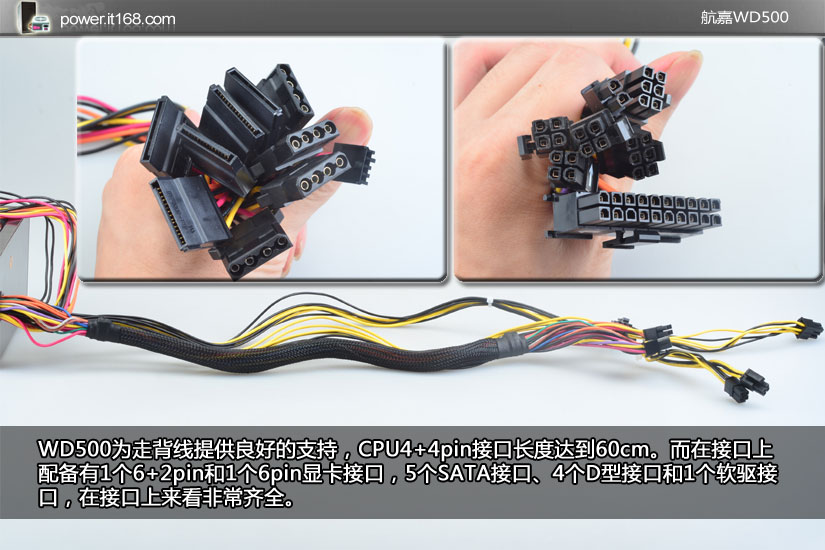 WD500为走背线提供良好的支持,CPU4 4pin接口长度达到60cm。而在接口上配备有1个6 2pin和1个6pin显卡接口,5个SATA接口、4个D型接口和1个软驱接口,在接口上来看非常齐全。