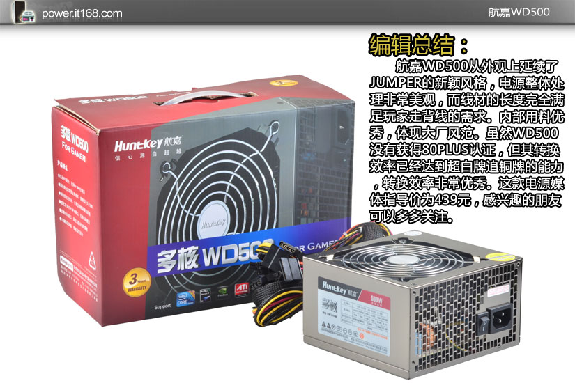 航嘉WD500从外观上延续了JUMPER的新颖风格,电源整体处理非常美观,而线材的长度完全满足玩家走背线的需求。内部用料优秀,体现大厂风范。虽然WD500没有获得80PLUS认证,但其转换效率已经达到超白牌追铜牌的能力,转换效率非常优秀。这款电源媒体指导价为439元,感兴趣的朋友可以多多关注。
