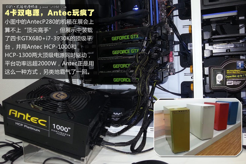 小图中的AntecP280的机箱在展会上算不上“顶尖高手”,但展示中装载了四卡GTX680+i7-3930K的顶级平台,并用Antec HCP-1000和HCP-1300两大顶级电源同时驱动,平台功率远超2000W,Antec正是用这么一种方式,另类地霸气了一回。