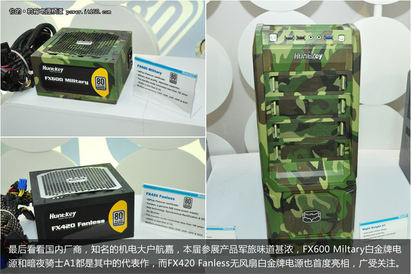 最后看看国内厂商,知名的机电大户航嘉,本届参展产品军旅味道甚浓,FX600 Miltary白金牌电源和暗夜骑士A1都是其中的代表作,而FX420 Fanless无风扇白金牌电源也首度亮相,广受关注。