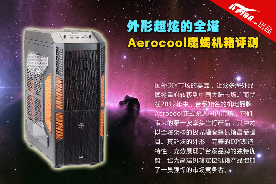 国外DIY市场的萎靡,让众多海外品牌将重心转移到中国大陆市场。而就在2012年中,台系知名的机电品牌Aerocool正式杀入国内市场,它们带来的第一波拳头主打产品,其中尤以全塔架构的极光橘魔蝎机箱最受瞩目。其超炫的外形,完美的DIY改造特性,充分展现了台系品牌的独特优势,也为高端机箱定位机箱产品增加了一员强悍的市场竞争者。