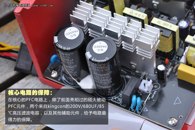 在核心的PFC电路上,除了前面亮相过的硕大被动PFC元件,两个来自kingcon的200V/680UF/85℃高压滤波电容,以及其他辅助元件,给予电路最得力的保障。