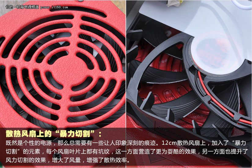 既然是个性的电源,那么总需要有一些让人印象深刻的痕迹。12cm散热风扇上,加入了“暴力切割”的元素,每个风扇叶片上都有坑纹,这一方面营造了更为耍酷的效果,另一方面也提升了风力切割的效果,增大了风量,增强了散热效率。