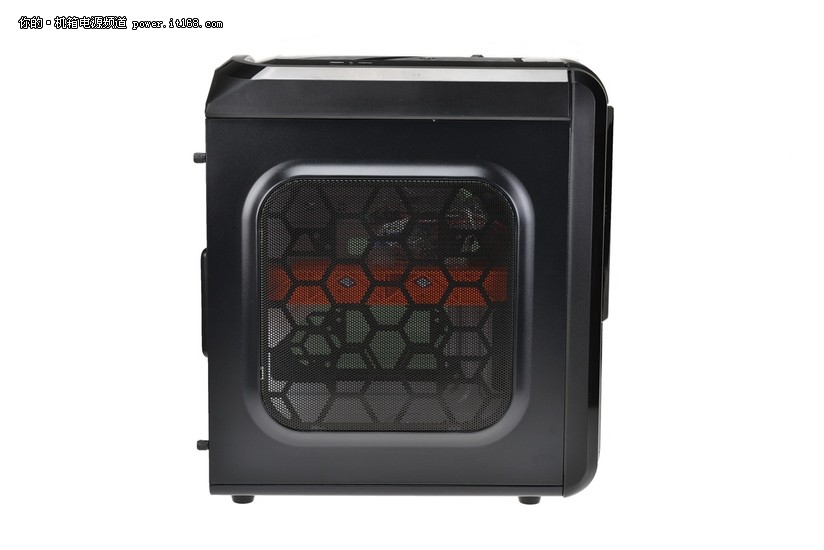 机箱右侧面板配备大面积的蜂窝状镂空设计,提升散热能力。