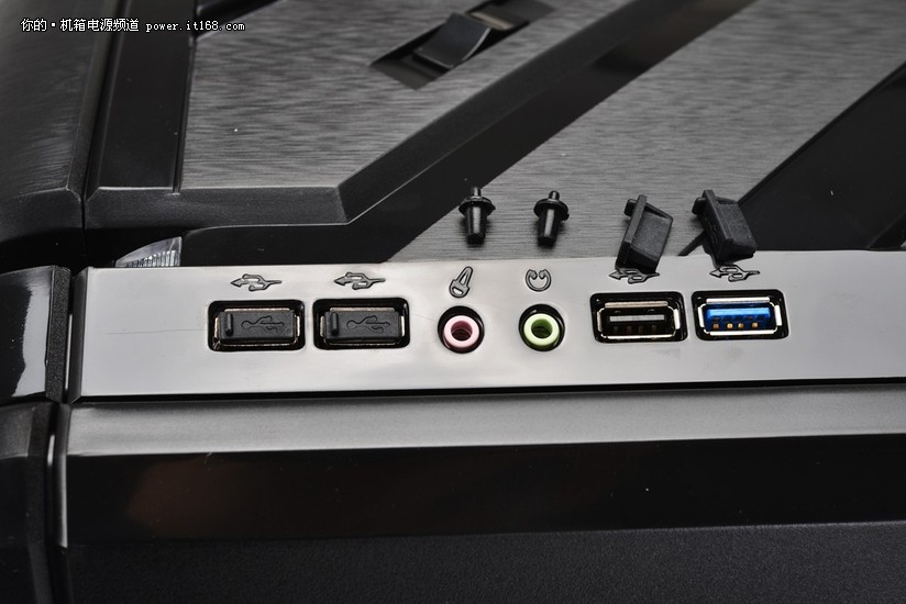 前端接口包括3个USB2.0、1个USB3.0及一组音频I/O接口,每个接口都用一个软胶塞堵住,在不使用的时候可以塞住达到防尘作用。