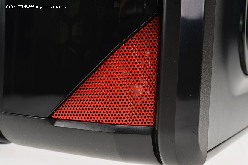 前置散热风扇藏在了金属冲网内,为了突出机箱的个性造型,金属冲网也采用三角形状。另外金属冲网后面还加装一块防尘网。