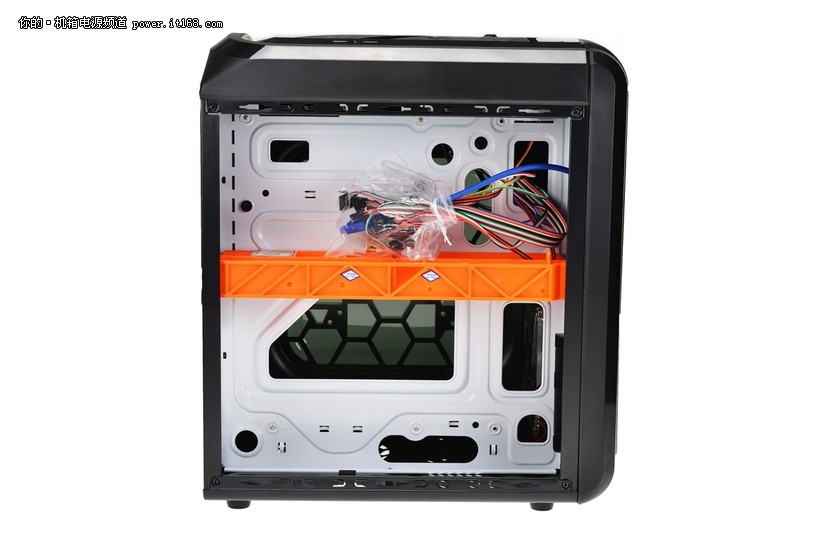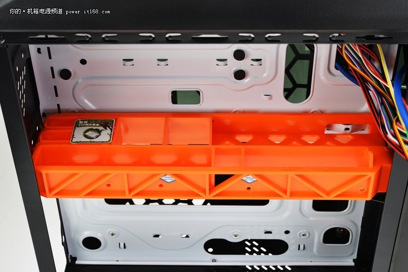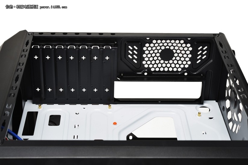 机箱中的双空间隔离设计,让主板、显卡、CPU“发热大户”与光驱、硬盘、电源进行冷热隔离,再利用直通式散热风道,为大热量的区间带去最高效的散热效果。图中是机箱的右侧空间,我们还可以见到五金架构的做工非常扎实,挡板为CPU背面设有大面积镂空和多个走线孔。