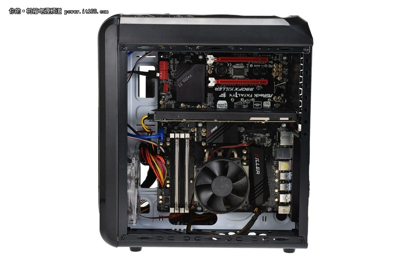 装机演实例(左侧),可轻松装入各种主流规格的主板和显卡,散热空间不比标准机箱少。要注意的是不要安装高度超过13CM的CPU散热器。